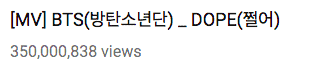Kore’ye göre 20 Ağustos 23:30 itibariyle, “Dope” klibi YouTube’da 350 milyon görüntülenme sayısına ulaştı! “Dope“, BTS‘in “DNA” ve “Fire“dan sonra bu görüntülenme sayısına ulaşan 3. klibi oldu.