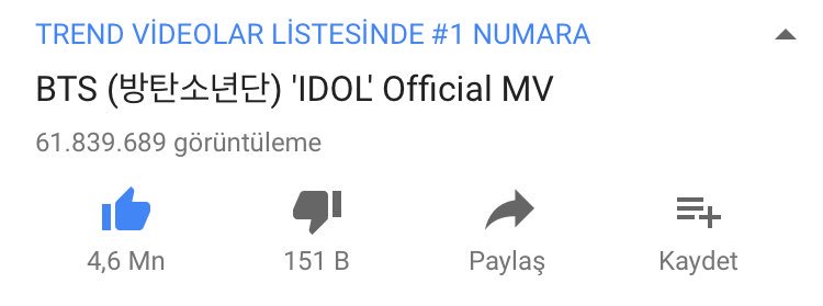 Kore saati ile 20:30 civarı, “IDOL” klibi YouTube’da 60 milyon izlenmeyi geride bıraktı. BTS, bu izlenmeye “IDOL“ın Kore saati ile 24 Ağustos 18:00’de yayımlanmasıyla birlikte 26 saat 30 dakikada ulaştı.