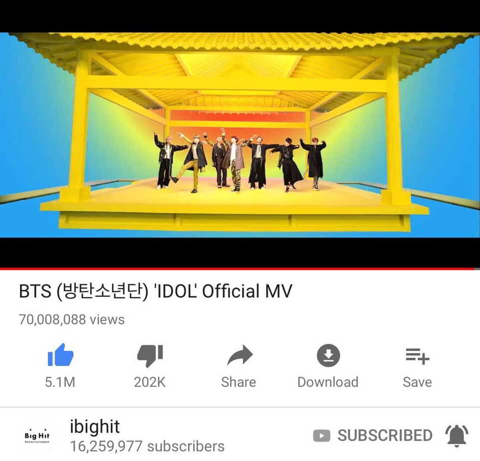 26 Ağustos Kore saatine göre 19:50’de, grubun son yayımladığı repackage albüm “LOVE YOURSELF: Answer”ın ana şarkısı “IDOL” YouTube’da 70 milyon izlenmeye ulaştı. Müzik klibi, 24 Ağustos Kore saatine göre 18:00’de yayımlanmıştı. Böylece grup tam olarak 53 saat 43 dakikada diğer bir deyişle 2 gün 5 saat 43 dakikada bu başarıyı elde etti.