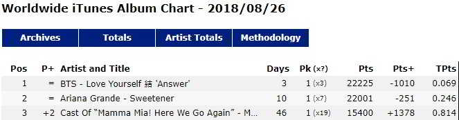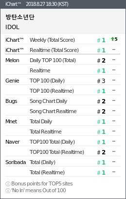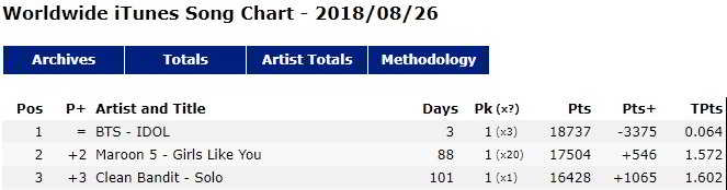 BTS yalnızca YouTube’da değil iTunes ve Kore müzik listelerinde de iyi bir iş çıkarıyor. IDOL, Dünya Çapındaki iTunes Şarkı Listesinde; LOVE YOURSELF: Answer ise Dünya Çapındaki iTunes Albüm Listesinde 3 gündür zirveye yer alıyor. IDOL’ın Kore müzik listelerindeki durumuna ise aşağıdaki tablodan bakabilirsiniz.