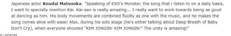 Japon aktör Koudai Matsuoka, “Sürekli dinlediğim Monster‘dan konuşurken, EXO Kai‘den bahsetmek istiyorum. Kai-san gerçekten harika. Onun gibi dans etmede iyi olmak için çalışmak istiyorum. Vücut hareketlerini müzik ile akıcı bir şekilde bir araya getiriyor ve şarkıyı yaşıyor. Ayrıca herkesin solo sahnesinde, “KIM JONGIN, KIM JONGIN” diye bağırmaları inanılmazdı.” diye konuştu.