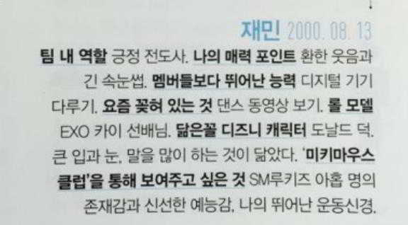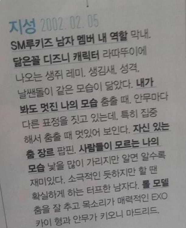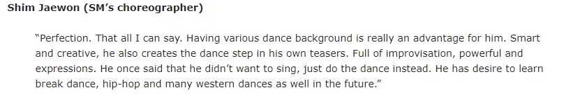 “Mükemmellik. Bütün söyleyebileceğim bu. Çeşitli dans altyapısına sahip olması onun için büyük bir avantaj. Zeki ve yaratıcı, teaserlarda dans adımlarını yaratıyor. Doğaçlama, güç ve ifadelerle dolu. Bir keresinde şarkı söylemek istemediğin, sadece dans edeceğini söyledi. Gelecekte break dans, hip hop ve birçok batı dansı öğrenme arzusuna sahip.” Shim Jae Won, Jongin’i en iyi tanıyan ve onun abisi, babası olan birinin onun dans tutkusu hakkındaki düşünceleri.