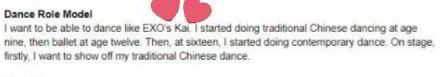 “EXO Kai sunbaenim gibi olmak istiyorum. Geleneksel Çin dansına 9 yaşında 12 yaşında da baleye başladım. Daha sonra 16 yaşında modern dans yapmaya başladım. Sahnedeyken ilk olarak Geleneksel Çin dansını göstermek istiyorum.”