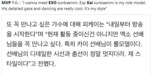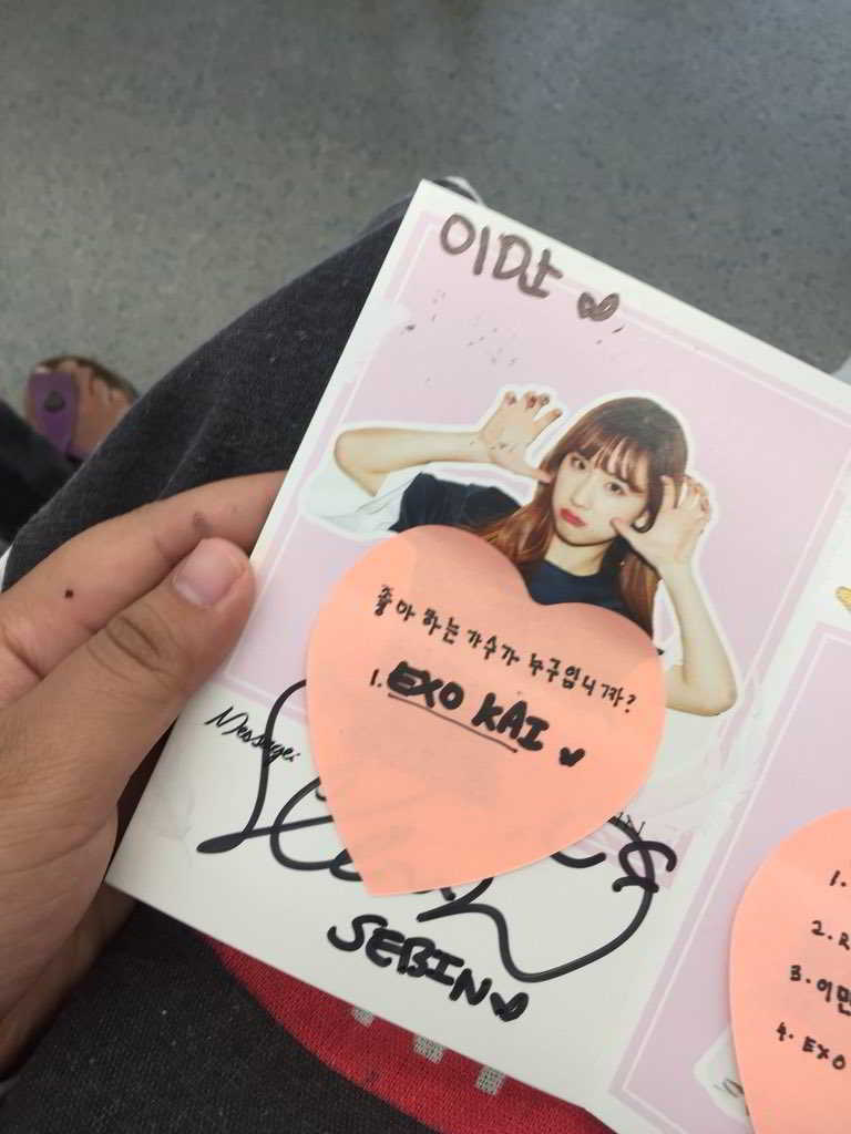 Kız grubu S.I.S’in üyesi Sebin imza gününde, “Rol modelin kim?” sorusuna, Kai’nin adını verdi. Sebin, “Kai ile performans sergilemek ve Kai’den dolayı idol olmak istediğini belirtti.