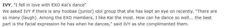 Ivy kendine yönetilen “Son zamanlarda ilgini çeken hoobae idol grupları olup olmadığı?” sorusuna, “Çok fazla var, EXO üyeleri arasında en çok Kai’yi seviyorum. Nasıl bu kadar iyi dans edebilir… Dans ederken en iyi özelliği sahip olduğu yüz ifadeleri.” Kai’nin sahnede gösterdiği performanslara beğenisini dile getirdi.