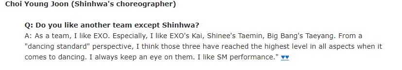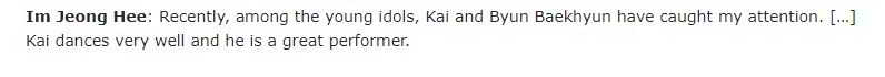 Shinhwa’nın uzun zamandır koreografı olan Choi Young Joon’a sorulan “Shinhwa dışında beğendiğiniz grup var mı?” sorusuna, “ Grup olarak EXO’yı seviyorum. Ayrı olarak EXO Kai, SHINee Taemin ve BIGBANG Taeyang’ı beğeniyorum. ‘Dans etme kalitesi” ile dikkat edilirse, bu üçünün dans denilince en üst seviyeye ulaştığını düşünüyorum. Her zaman onlara dikkat ediyorum. SM performanslarını seviyorum.” cevabı ile Jongin yine dansı ile bu konuda eğitimli biriden daha geçer not aldı.
