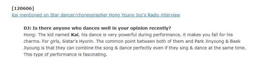 2012 yılında daha EXO yeni çıkış yapmış bir grup iken ünlü dansçı-koreograf Hong Young Joo’nun takdirini kazanan çaylak idol Kai-ssi. Katıldığı radyo şovunda verdiği röportajda, “Son zamanlarda dans da iyi olduğunu düşündüğün birileri var mı? sorusuna, “Kai adından bir çocuk. Performans sırasında dansı çok güçlü ve bu cazibesi ile ona düşüyorsunuz/hayran oluyorsunuz.” cevabını verdi.