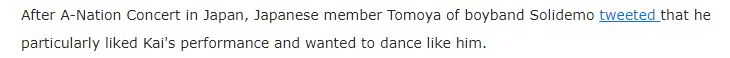 2015 yılındaki a-nation müzik festivalinden sonra Solidemo erkek grubun Japon üyesi Tomoya, özellikle Kai‘nin performansını beğendiğini ve onun gibi dans etmek istediğini belirten bir tweet attı.