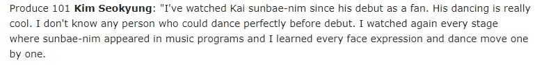 “Benim içinde Kai sunbaenim. Çok havalı, seksi olduğunu ve iyi dans ettiğini düşünüyorum.” – Ong Seungwoo