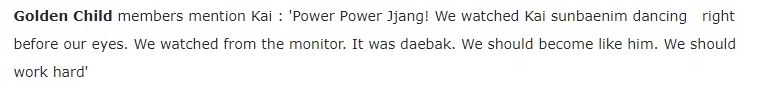 Golden Child grup üyeleri Kai ile karşılaştıkları programda ona hayranlıklarını gizleyememişlerdi. “Power, Power en iyisi! Hemen önümüzde Kai sunbaenimizin dansını izledik. Monitörden izledik. Harikaydı. Onu gibi olmalıyız. Çok çalışmalıyız.