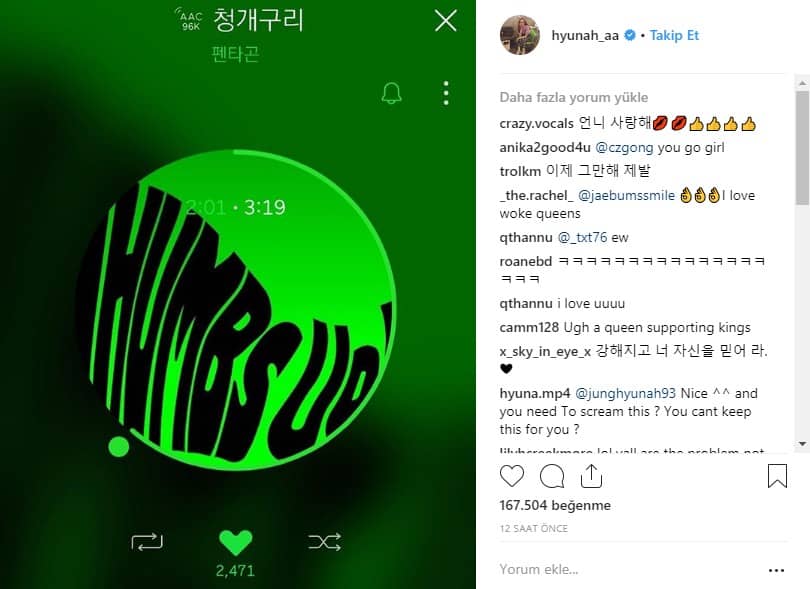 Hyuna, 10 Eylül’de, Pentagon’ın yeni şarkısı olan ‘Naughty Boy’un ekran görüntüsünü kişisel instagram hesabında paylaşarak, onlara olan desteğini gösterdi.