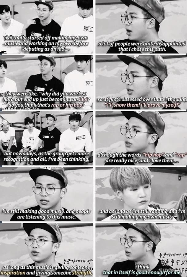 “Aslında idol olarak çıkış yapmadan önce kendi müziğimi yapmaya ve kendi başıma çalışmaya başlamıştım, birçok insan bu yolu seçtiğim için oldukça hayal kırıklığına uğramıştı. Onlar, “Neden bu kadar çok çalıştın, yani bunun sonucunda idol mü olacaksın? Bunun rap ya da hip hop olduğunu mu düşünüyorsun?” gibi şeyler söylüyordu. Bu yüzden, ilk başlarda takıntılıydım. “Onlara göstereceğim, kendimi kanıtlayacağım.” diye düşünüyordum. Ama bugünlerde, grubun daha fazla tanınırlık kazanmasından öte, “hip hop” ve “rap” kelimelerinin gerçekten güzel olduğunu ve onları çok sevdiğimi düşünüyorum. Hâlâ iyi müzik yapıyorum ve insanlar bu müziği dinliyor. Rap yapmaya ve kendi müziğimi üretmeye devam ettiğim sürece bu müzik birilerine güç ve ilham veriyorsa, bu benim için yeterli.”