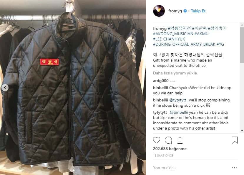 Diğer fotoğrafta Yang Hyun Suk’un adı kazınmış olduğu askeri bir kıyafet olan hediyesini gösteriyor.