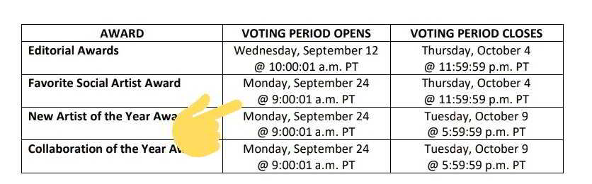 “Oylamalar 24 Eylül’de başlayacak. Üç öğe ile (isim, kategori etiketi, AMAs etiketi) birlikte bir hesapla günde 100 oy verilebilecek. Daha fazla bilgi oylamalar başlayınca verilecek.”