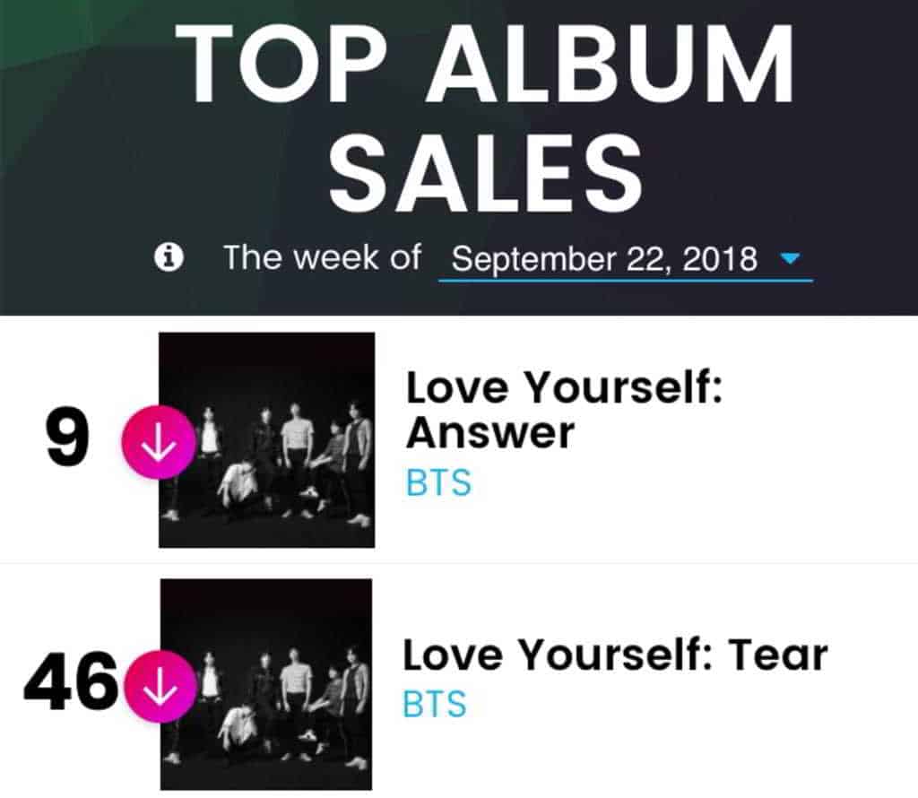 Top Albüm Satışları listesinde ise “Love Yourself: Answer” 9, “Love Yourself: Tear” 46 numarada bulunuyor.