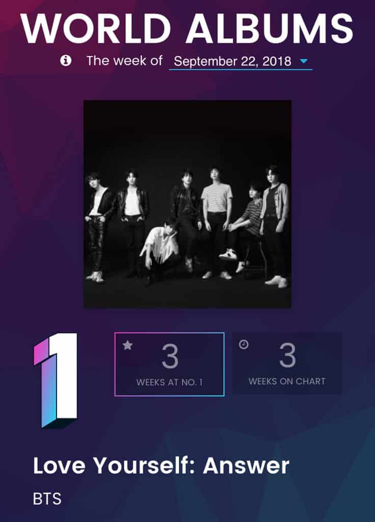 BTS, Dünya Albümleri listesinde “Love Yourself: Answer” ile 1, “Love Yourself: Tear” ile 2 ve “Love Yourself: Her” ile 3 numaraya yerleşerek, bir kez daha listenin ilk üç sırasında gücünü gösterdi. Japonca albümleri “Face Yourself” ise 8. sırada yerini aldı.