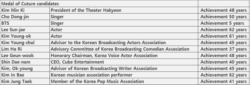 Ağustos ayında, BTS‘in bu yıl ki Kültürel Liyakat Nişanı için 12 adaydan biri olduğu açıklanmıştı. 8 Ekim’de, kazananlar kabine toplantısında belirlendi.