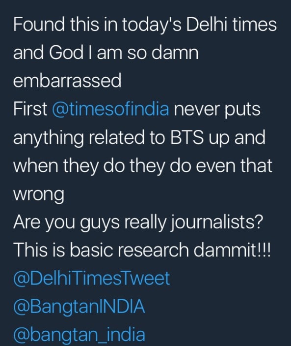 Ayrıca enternasyonel bir hayran da, “Bugün bunu Delhi Times’da buldum ve Tanrım, çok utanıyorum. İlk olarak, ‘Times of India’ BTS ile alakalı hiçbir şey yayımlamaz ama yayımladıklarında da onu bile yanlış yapıyorlar. Gerçekten gazeteci misiniz? Bu sadece küçük bir araştırma gerektirir!” dedi.