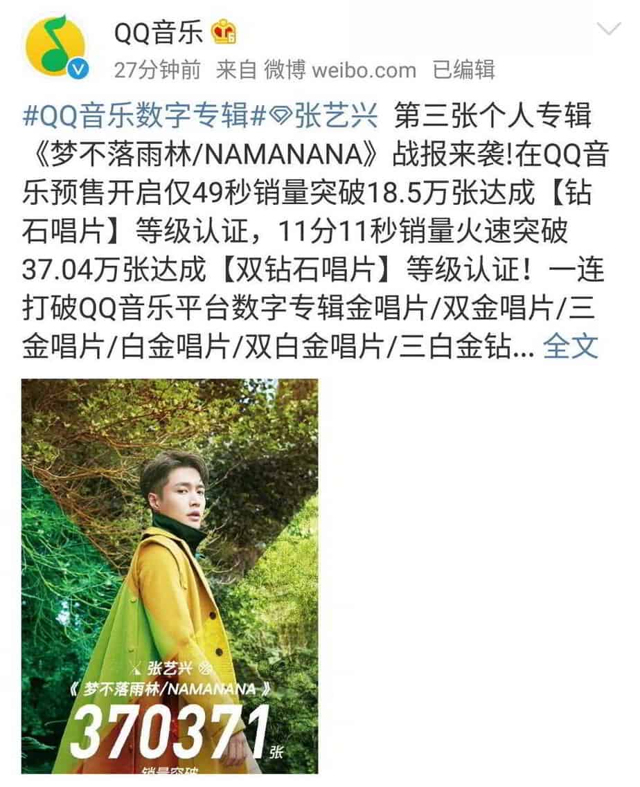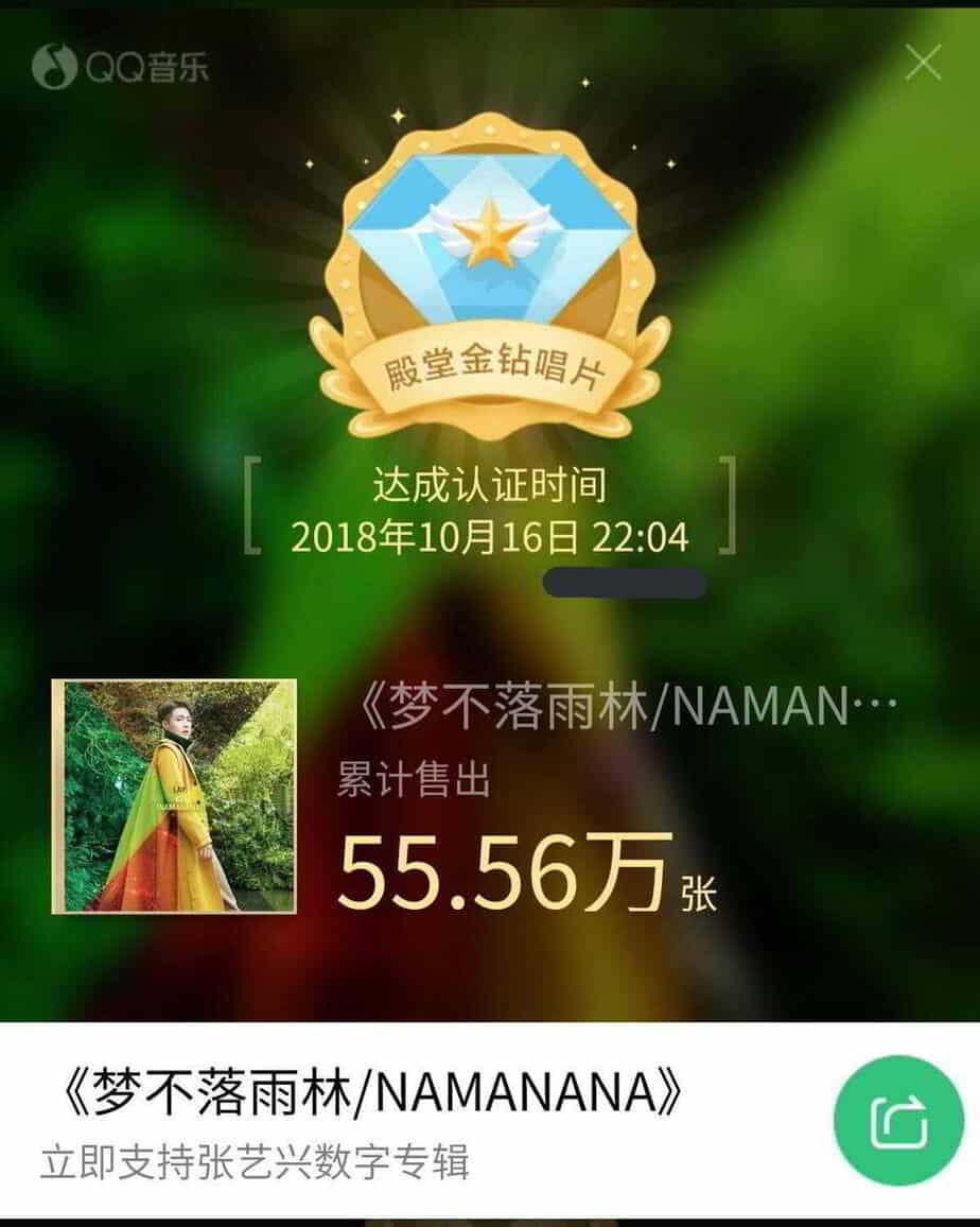 Ön siparişlerin açılmasından sadece 1 dakika sonra QQ Müzikte 5 Milyon Yuan satış gerçekleştirerek “NAMANANA” “Elmas (Diamond)” statüsüne ulaştı. 11. dakikanın içerisinde ise 370.4 bin satış ( 10 Milyon Yuan) ile “Çift Elmas (Double Diamond)” sertifikasını aldı.