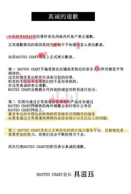 Hanteo’nun yayınladığı Çince özür yazısı;