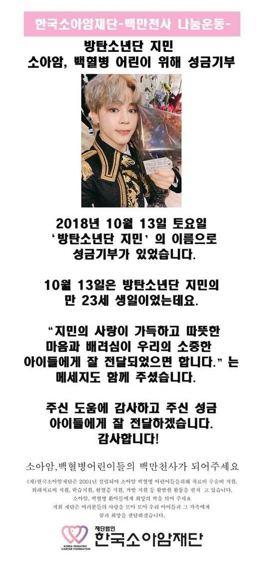 Kore Pediatri (çocuk hastalıklarıyla ilgili hekimlik dalı) Vakfı, geçtiğimiz günlerde vakfa BTS üyesi Jimin adına bağış olduğuyla ilgili tweet paylaştı. Jimin’in hayranları, onun 23. doğum gününü kutlamak için 13 Ekim’de bağışta bulundular.