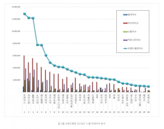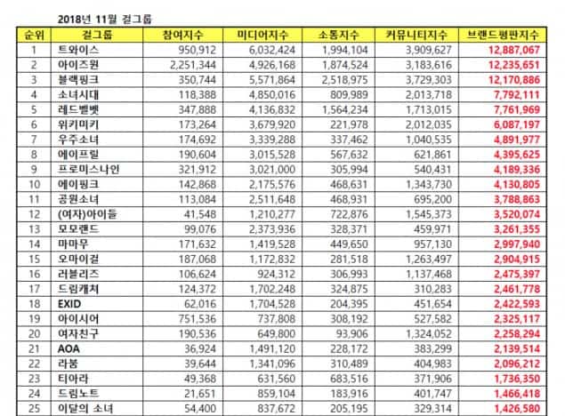 Enstitü, 8 Ekim – 9 Kasım 2018 tarihleri arasındaki toplam verileri inceledi. TWICE bu ay toplamda 12.887.067 puanla 1. sıraya yükseldi. IZ*ONE, marka değeri sıralaması grafiğinde ilk kez 12.235.651 puan ile 2. sırada yer aldı. Son olarak, Black Pink’in 3. sıradaki puanı ise 12.180.886 olarak belirlendi. Bu veriler ışığında en iyi 3 kız grubu için sıralamanın Kasım ayında oldukça rekabetçi olduğu kanıtlandı.