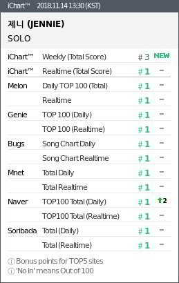 14 Kasım 1:30 itibariyle single “SOLO”nun çıkmasından yaklaşık 2 gün sonra 6 büyük yerel gerçek zamanlı ve günlük müzik grafiklerinde 1. sırayı aldı. Böylece gerçek zamanlı iChart’te 1. oldu.