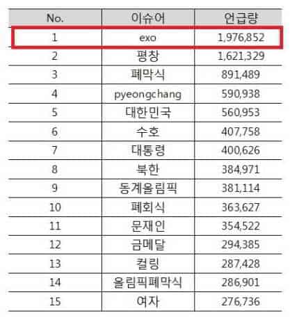 Bunun yanı sıra toplantıda PyeongChang Kış Olimpiyatlarının büyük veri analizi de açıkladı. Kapanış seremonisine katılan EXO (1.976.582 kez bahsedildi) ilk sırada yer alırken Maskot ‘Suho’, Moon Jae-in, Kuzey Kore ve Curling gibi kelimelerde bu listede yer aldı.