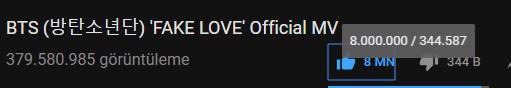 BTS‘in “Fake Love” MV’si, bir ilki başararak YouTube‘da 8 milyon beğeniye ulaşan ‘ilk’ K-POP grubu MV’si oldu.