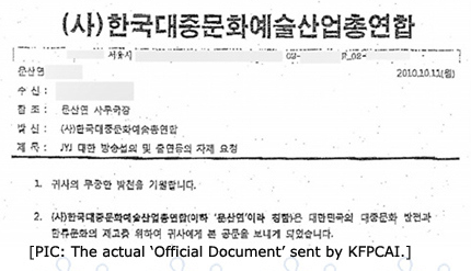 13 Ekim 2010’da KFPCAI 3 ana resmi yayın kuruluşuna, kablolu TV kanallarına, plak şirketlerine, dağıtımcılara, basına ve diğer alakalı organizasyonlara JYJ’i herhangi bir TV yayınına çıkmasını engellemeleri için döküman gönderdi.