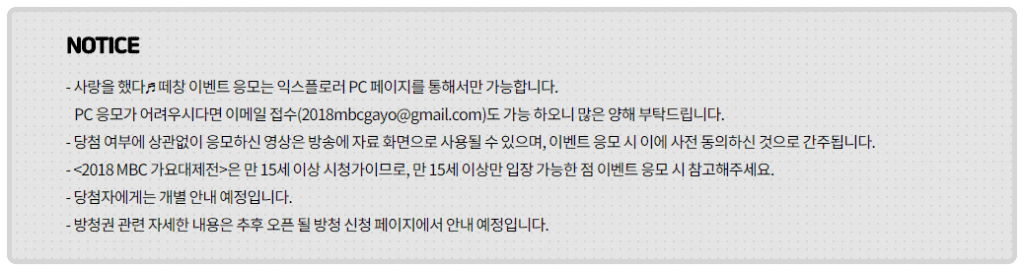 Teknik olarak, herhangi bir yaş, milliyet, cinsiyet sınırlaması olmadan herkes etkinliğe katılabilir. Etkinliğe katılmakla ilgileniyorsanız, videonuzu kimliğinizle birlikte [email protected] adresine gönderebilirsiniz. Etkinliğin kazananları, MBC’nin 2018 Gayo Daejejeon biletlerine, hediye setine ve daha fazlasına sahip olacak.