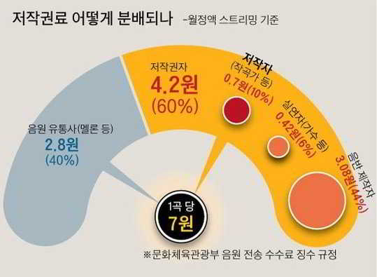 Her şarkının stream başına toplam kazancı 7 sent (KRW). Toplam; 5 farklı sektöre ayrılır: stream siteleri (Melon veya Soribada gibi), telif hakkı sahibi, yazar, performansçı (şarkıcı vs.) ve kayıt yapımcısı. Sırasıyla her sektör için alım yüzdeleri şu şekilde; stream siteleri: %40 (2.8 sent) ve telif hakkı sahibi %60 (4.2 sent) ( bu da 3 alt kategoriye ayrılıyor; %10 (şarkı sözü yazarı, besteci), %6 (şarkıcı) ve %44 (yapımcı).
