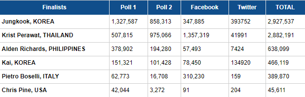 Jungkook, 2.882.191 oy ile ona çok yakın olan Taylandlı aktör Krist Perawat‘a karşı zorlu bir rekabet yaşadı. “Sotus” yıldızı, Facebook anketimizi 1.357.319 puanla zirvede bitirdi ve fotoğrafı, sosyal medya platformunda 458.400 kez paylaşıldı. Diğer yandan Jungkook, çevrimiçi oylamaya ve Twitter anketine hükmetti.