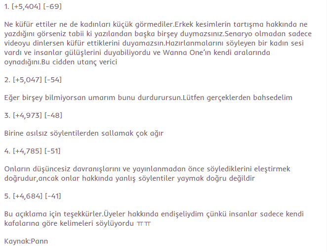 Şimdi diyeceklerime gelelim.Bu olayda Wanna One’ı gerçekten seven Wannable’ler kendini o kadar güzel belli etti ki. Çünkü çok iyi hatırlıyorum gördüğüm bazı Wannable’lar onlara sırtını dönmüştü ve söylenmedik laf bırakmamıştı.Ama gerçekten seven Wannable’ler kesin birşey olmadan onları suçlamak yerine korumayı tercih etmişti.Zaten aslında başından böyle birşey olmadığı belliydi ama insanlar onları dibe çekmek için bahane arıyordu ve bu durumu koz olarak kullandı.Wanna One’a boşuna iftira atıldı,boşuna kötü yorumlara maruz kaldı ve boşuna geri dönüşü mahfoldu.Wannable olarak sinir krizi geçirdik.Derdimizi anlatmaktan dilimizde tüy bitti.Sonradan olay kapansa da şunu diyeceğim inşallah o yanlış söylentileri çıkartanlar yaptıklarının cezasını çeker.O uydurdukları dedikodular kendi başlarına gelir.Çünkü hiçbir suçunuz günahınız olmadığı halde size iftira atılması kadar kötü birşey yoktur!