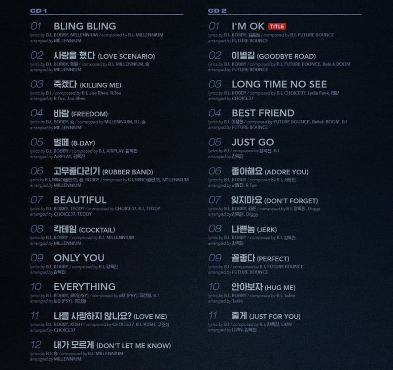 “I’m OK” de dahil olmak üzere albümdeki tüm 23 parçayı üyelerden B.I yazıp besteledi. Ayrıca Bobby de söz yazımına katıldı. Albüm 7 Ocak‘ta piyasaya sürülecek.