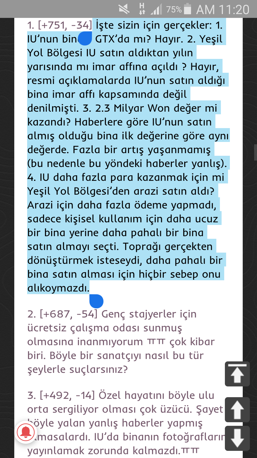 1. [+751, -34] İşte sizin için gerçekler: 1. IU’nun binası GTX’da mı? Hayır. 2. Yeşil Yol Bölgesi IU satın aldıktan yılın yarısında mı imar affına açıldı ? Hayır, resmi açıklamalarda IU’nun satın aldığı bina imar affı kapsamında değil denilmişti. 3. 2.3 Milyar Won değer mi kazandı? Haberlere göre IU’nun satın almış olduğu bina ilk değerine göre aynı değerde. Fazla bir artış yaşanmamış (bu nedenle bu yöndeki haberler yanlış). 4. IU daha fazla para kazanmak için mi Yeşil Yol Bölgesi’den arazi satın aldı? Arazi için daha fazla ödeme yapmadı, sadece kişisel kullanım için daha ucuz bir bina yerine daha pahalı bir bina satın almayı seçti. Toprağı gerçekten dönüştürmek isteseydi, daha pahalı bir bina satın alması için hiçbir sebep onu alıkoymazdı.