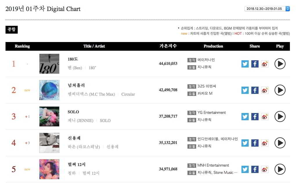Ben’in hit şarkısı “180 Degrees”, dijital albüm grafiğinde listenin en üst sırasında yer alarak 1. oldu. MC the Max’ın yeni ballad tarzı “After You’ve Gone” 2. sırada yer aldı. BLACKPINK’den Jennie “SOLO” ile 3. sırada yer alırken Haeun ise, “Shin Yong Jae” ile 4. sırada yer almayı başardı. Chungha ise “Gotta Go” ile listenin 5. sırasında kendine yer edindi.
