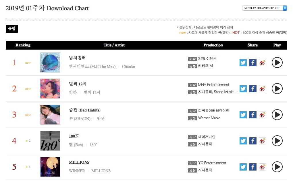 MC the Max “After You’ve Gone” ile bu haftanın en çok indirilen şarkısı olarak listede 1. sırada yer aldı. Chungha “Gotta Go” 2.sırada, Shaun “Bad Habits” ile 3. sırada, Ben ise “180 Degrees” ile 4. sırada yer aldı ve son olarak WINNER “Millions” ile listede 5. sırada yer aldı.