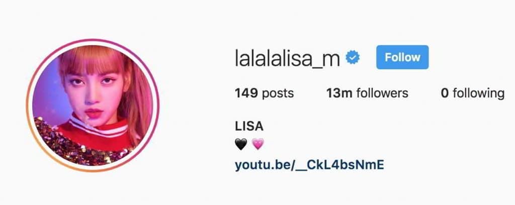 13 Ocak‘ta Lisa‘nın Instagram’da ki takipçi sayısı yaklaşık 13 Milyon oldu. Ve bu rakam onun Instagram’da en çok takipçisi olan kadın ünlü ünvanını almasına neden oldu. Bu ünvanın sahibi Girls’ Generation’dan Taeyeon’du. Ve Taeyeon‘un takipçi sayısı 13 Ocak itibariyle 12.9 Milyon.