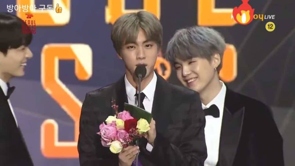 Jin daha sonra Big Hit Entertainment’ın yaklaşan erkek grubu TXT‘ten bahsetti. Jin, “Ajansımız bunu söylememi istemedi, ancak genç sanatçılarımız ilk kez geliyor. Lütfen onlara göz kulak olun. Teşekkür ederim!”