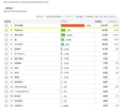 TVXQ 2008, 2009 ve 2011’de Japonya’nın yıl sonu müzik programı Kohaku Uta Gassen‘de performans sergiledi. 2011’de tarihi bir zafer elde etti. Grup, 42.6% izleyici reytingi almasının yanısıra en büyük sanatçılardan Arashi, SMAP, AKB48, Perfume, SNSD ve KARA dahil toplam 21 grubu geride bırakarak oyların neredeyse yarısını aldı. Oylama yalnızca Japonya ve Kore’dekilere açıktı ve enternasyonel fanlar oylamaya katılamadı. Oylamada kişi başına 1 oy geçerliydi. Tekrarlanan oylar (1’den fazla atılan) çıkarılınca TVXQ şok edici bir şekilde oyların 65.3%‘ünü alarak 1.liğini korudu.