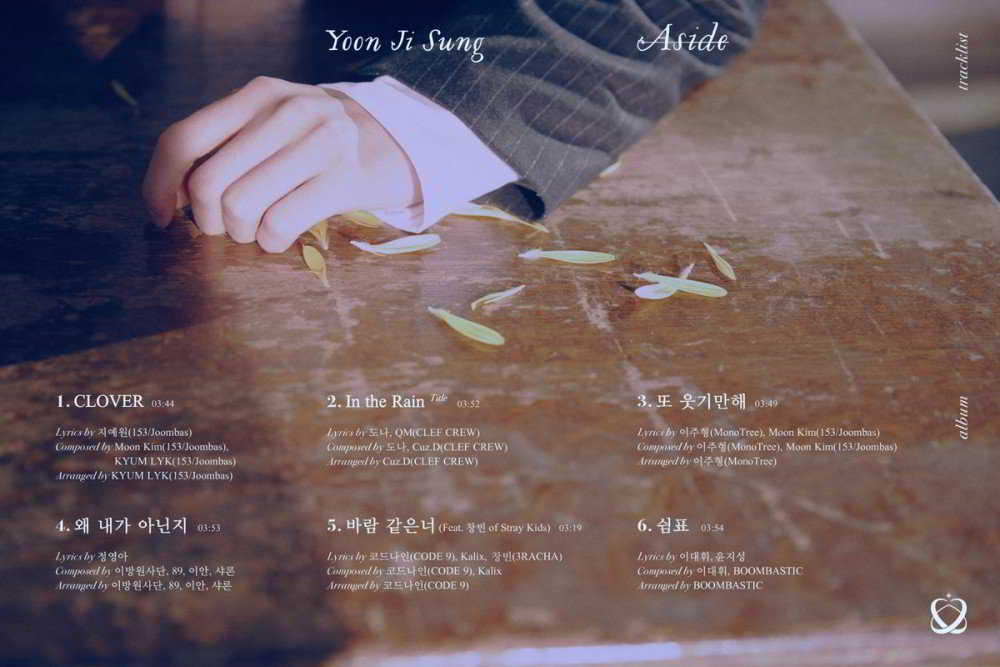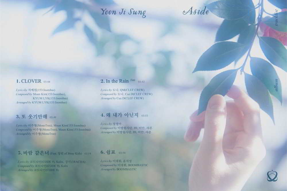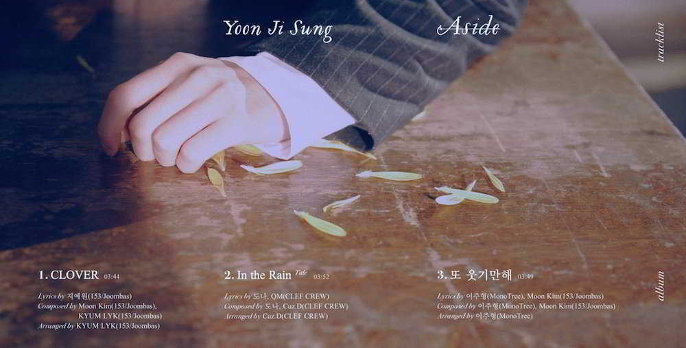 Yoon Ji Sung’un yaklaşan 1. mini albümünde toplam 6 şarkı bulunuyor. Başlık şarkısı ‘In The Rain”, “Clover”, “I Just Go On Laughing”, “Why Is It Not Me”, Stray Kids (aka 3RACHA) Changbin‘in eşlik ettiği “You Like the Wind” bulunuyor. “Aside”ın bestesi ise Wanna One üyesi Lee Dae Hwi tarafından yapıldı.