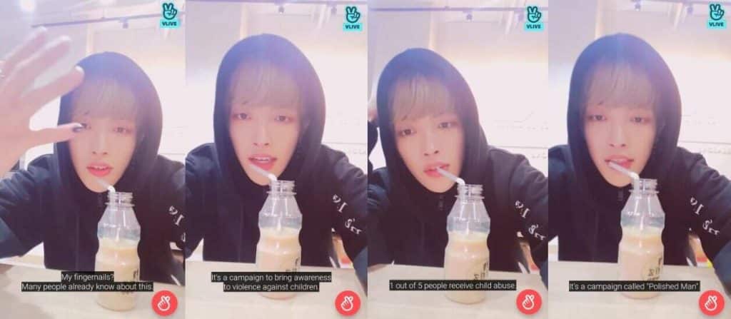 (Hongjoong: ”Tırnaklarım? Birçok insan bunu zaten biliyor. Bu çocuk istismarına farkındalık yaratmak için bir kampanya. Her 5 çocuktan 1’i istismara uğruyor. Bu ‘Polished Man’ isimli bir kampanya.”)