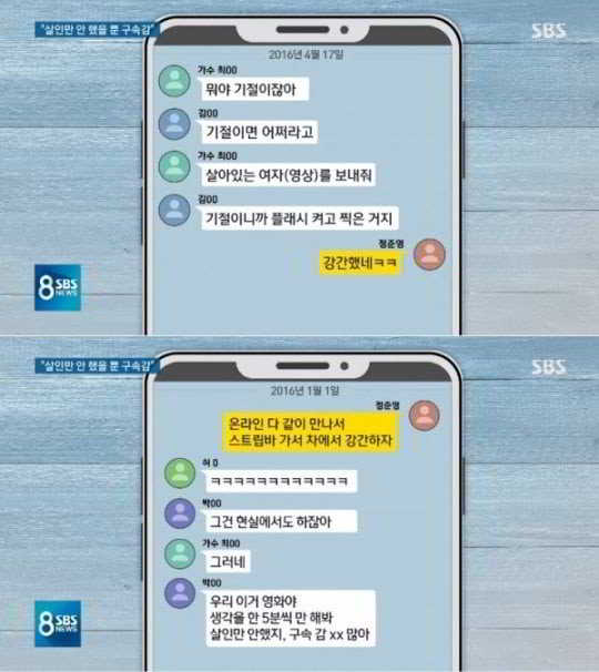 Diğer chat odasındaki katılımcılar, uyku hapı verdikten sonra kadınlarla nasıl ilişkiye girdiğini anlattı ve Jung Joon Young bu durum için kadınları suçladı. Bir mesajda Jung Joon Young, “Hepimiz çevrimiçi buluşup bir striptiz kulübüne gidelim ve onlara arabada tecavüz edelim.” dedi. Chat odası üyesi Park, “Biliyorsun, bunu gerçek hayatta da yapıyoruz.” dedi. Şarkıcı Choi bunu onayladı ve sonrasında Park, “Bu bir film. 5 dakika düşün. Kimseyi öldürmedik ki. Bütün p**ler hapse bunun için girdi.” dedi.