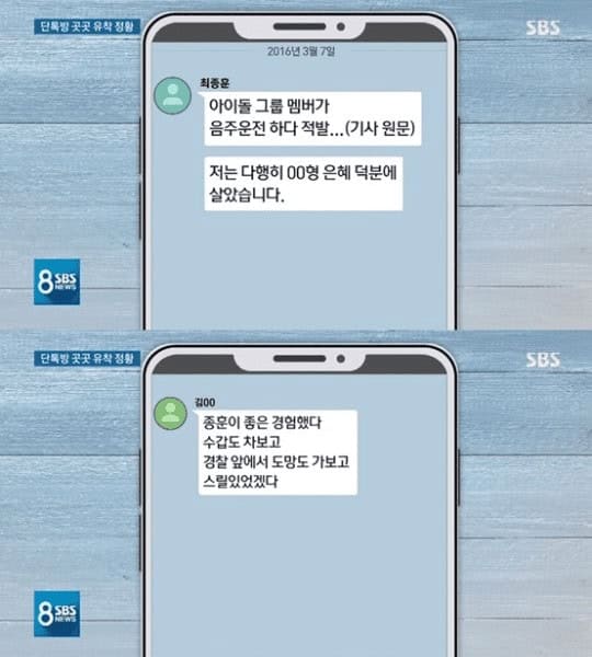 SBS tarafından yayınlanan KakaoTalk mesajlarına göre Choi Jong Hoon 7 Mart 2016’da bir idolün alkollü araç kullanırken nasıl yakalandığına dair bir yazı paylaştı ve, “Neyse ki X hyung’un [isim yazılmamış] yaptığı iyilikle kurtuldum.” dedi.