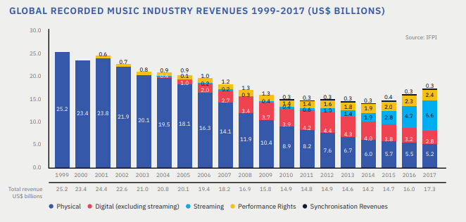 Müzik endüstrisi yaklaşık 15 yıldır gelirlerinde azalma yaşıyor ve yapım şirketleri, özellikle dijital inovasyon yoluyla yeni büyüme biçimlerine odaklanarak bu eğilime yanıt verdi. Bu çabalar 2017 yılında küresel gelirin % 8,1 oranında artmasıyla sonuçlandı. Streamlerden sağlanan %41,1 oranındaki gelir, dijital müzikle birleştiğinde toplam gelirin %54’ünü oluşturarak, en büyük gelir kaynağı oldu.
