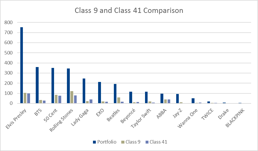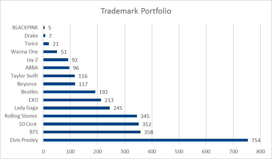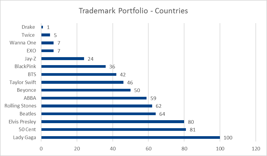 En geniş on portföye sahip tüm sanatçılar EUIPO (Avrupa Birliği Fikri Mülkiyet Ofisi) siciline kayıt yaptırmıştır. Beklenmedik şekilde ortaya çıkan diğer önemli pazarlar ABD, Çin, Japonya ve Avustralya’dır. K-pop’un globalleşmesine rağmen, Koreli markalar, yerel alanda ve Japonya ve Çin gibi komşu ülkelerle sınırlı olmak üzere, dar alanda korunmaya sahipler. Yalnızca BTS ve BLACKPINK’in Avrupa’da bir kaydı ve TWICE’ın da ABD’de kaydı bulunuyor. Kanadalı sanatçı Drake, markalarını yalnızca Amerika’da tescil ettirdi. Bununla birlikte, bir kişi 2010 yılında DRIZZY DRAKE ismini kendi marka korumasına almaya çalıştı ancak bu girişim, 2011’de Aubrey Drake Graham (Drake) tarafından başarıyla engellendi. Lady Gaga, 100 ülkede ticari marka kayıtları ile en fazla kapsama alanına sahip sanatçıdır.