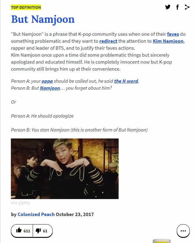 “But Namjoon”, RM’nin gerçek adı Kim Namjoon’un kullanılmasıyla oluşturulan bir ifade. Urban Dictionary bu ifadeyi, “K-pop camiasında birileri, kendi sevdiği sanatçılardan biri sorunlu bir şey yaptığında, dikkati BTS’in rapçisi ve lideri Kim Namjoon’a yönlendirmek ve kendi favorisi olan kişilerin eylemlerini haklı çıkarmak istediğinde kullandığı terim” olarak açıklamıştır. “But Namjoon” aracılığıyla, K-pop yıldızı ve BTS lideri, K-pop topluluğundaki tüm sorunlu meselelerde suçlanacak günah keçisi haline getirildi. Bu ifade, Namjoon’un diğer rapçilerin sözlerini çaldığı iddiası da dahil olmak üzere çeşitli konularda suçlanmasının ardından kullanılmaya başladı.