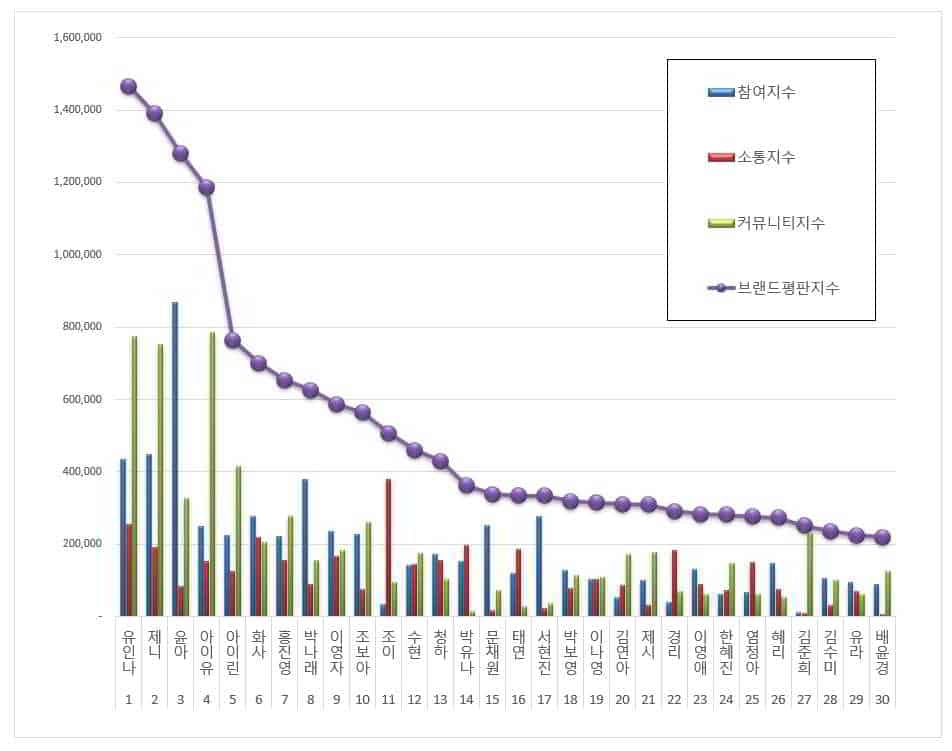 Kore Kurumsal İtibar Enstitüsüne göre Yoo In Na, Mart verilerinin başında geliyor, ardından BLACKPINK‘den Jennie ve Girls’ Generation‘dan Yoona takip ediyor. 19.166.592 adet veri 28 Şubat – 30 Mart arasında incelenmiştir. Yoo In Na 1.465.908, Jennie 1.389.562 ve Yoona 1.279.263 puan elde ettiler.