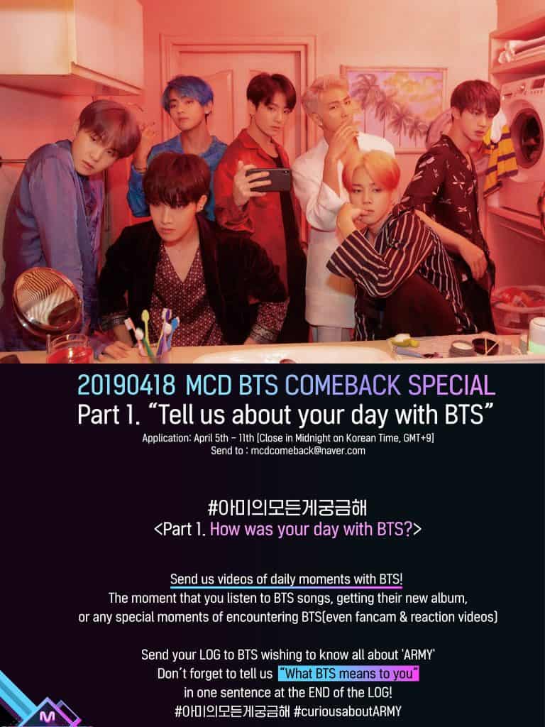 20190418 <MCD BTS COMEBACK SPECIAL> BTS와 함께한 당신의 하루를 들려주세요! 어떤 이야기라도 좋아요! #아미의모든게궁금해 #BTS #방탄소년단 #MCOUNTDOWN 자세한 내용은 첨부된 이미지를 참고해 주세요! pic.twitter.com/29g9WGfBpB